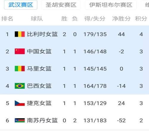 結束這一場比賽后,女籃所處的A組最新積分形勢也出來了,2戰全勝的比利時高居榜首,中國隊、馬里、巴西、捷克都是1勝1負積3分,分列第2-第5,中國隊凈勝分-2,憑借上一輪擊敗馬里的優勢以及本輪捷克爆冷輸球,排名不降反升來到第二。