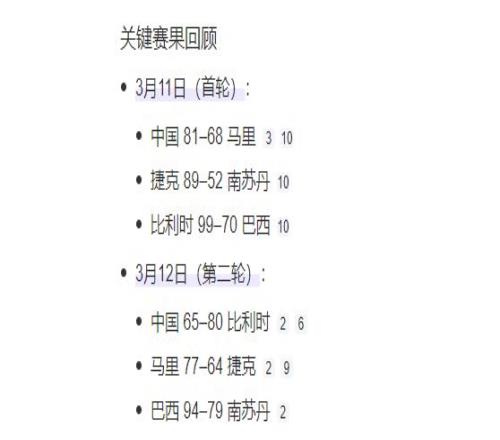 由于首輪中國女籃擊敗了馬里,第二輪馬里擊敗了捷克,對比勝負關系后,捷克凈勝分雖占優,但也只能排在第五。小組墊底是2負積2分的南蘇丹女籃。