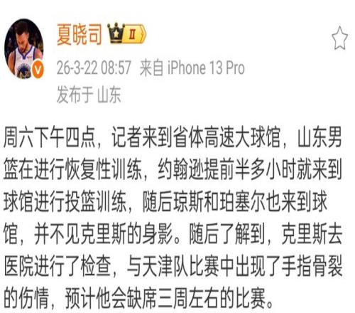 第二階段開始后,山東男籃表現不是很理想,一方面是新外援磨合的不好,還有就是出現了一些傷病情況,根據山東媒體報道,山東男籃大將克里斯出現了手指骨裂的情況,需要休息至少三周,這對于山東男籃打擊不小。