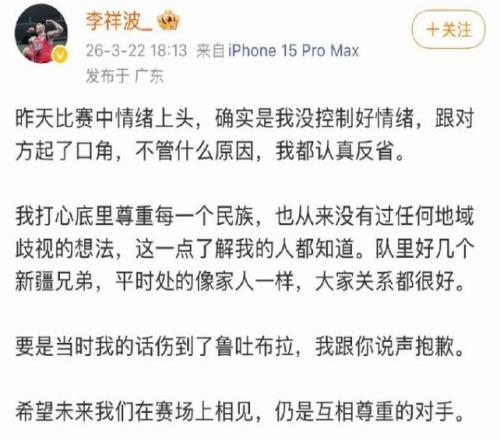 CBA官方宣布:李祥波停賽4場+罰款10萬,魯吐布拉停賽1場+罰款5萬。