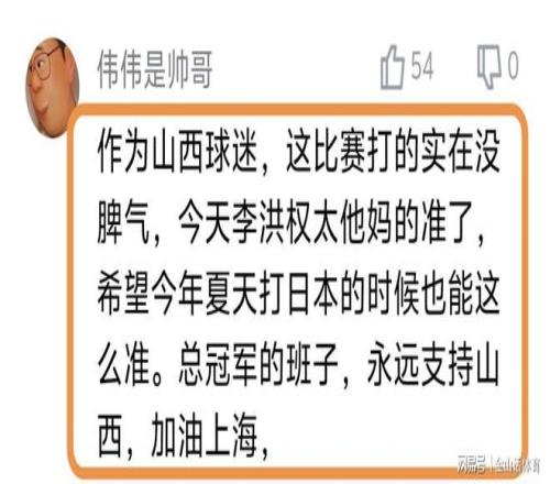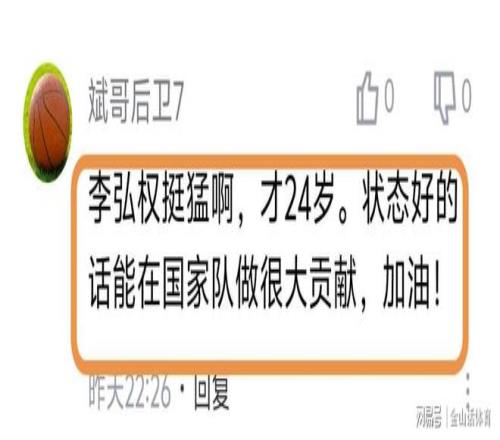 李弘權出色的表現,也讓球迷們是喜出望外,賽后紛紛在網絡平臺留言。“作為山西球迷,這比賽打的實在沒脾氣,今天李洪權太準了,希望今年夏天打日本的時候也能這么準。總冠軍的班子,永遠支持山西,加油上海,”;“李弘權挺猛啊,才24歲。狀態好的話能在國家隊做很大貢獻,加油!”;“真心話,就這國家隊以前都不帶李弘權。希望今年世預賽也能進入國家隊,也能這么準,好好收拾小本子。”……
