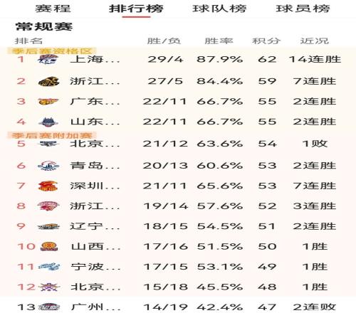 山東隊憑此役勝利牢牢守住前四席位;北京首鋼雖敗猶存希望,但領先身后的追兵優勢已被壓縮至0.5個勝場;遼寧隊繼續領跑爭冠第一梯隊;北控則借絕殺之勢,將與前一名的差距縮小至僅1場勝差。