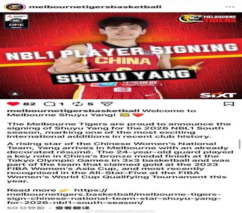 中國女籃隊長首次留洋!NBL1聯賽墨爾本老虎女籃官宣楊舒予簽約