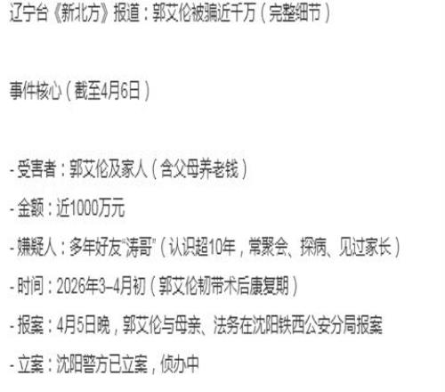 近日,國內媒體報道近期郭艾倫與家人,被多年好友“濤哥”詐騙,損失近千萬元。