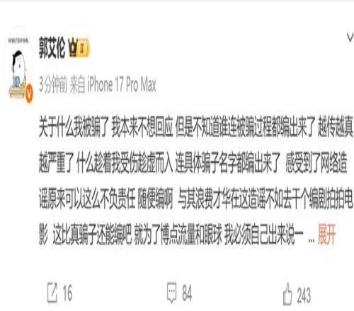 “感受到了網絡造謠,原來可以這么不負責任,隨便編啊!與其浪費才華在這造謠,不如去干個編劇,拍拍電影。這比真騙子還能編吧!就為了博點流量和眼球,我必須自己出來說一句了:我沒有被騙,謝謝大家關心。”