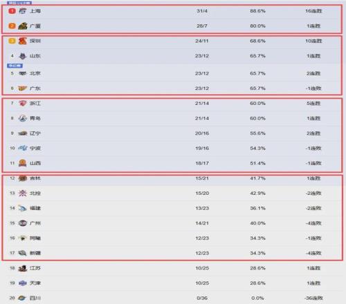 最后第三檔球隊分別為吉林、北控、廣州、福建、南京、新疆,這6支球隊均有機會去沖擊季后賽附加賽最后一席。而江蘇、天津和四川是第四檔魚腩球隊,他們已經無緣季后賽。