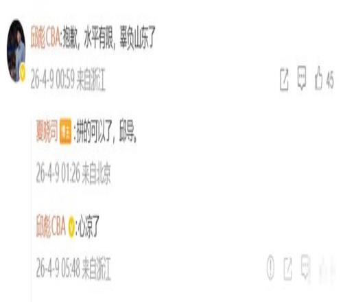 沒想到,邱彪竟然在凌晨對這條信息進行了留言,他寫道:“抱歉,水平有限,辜負山東了。”