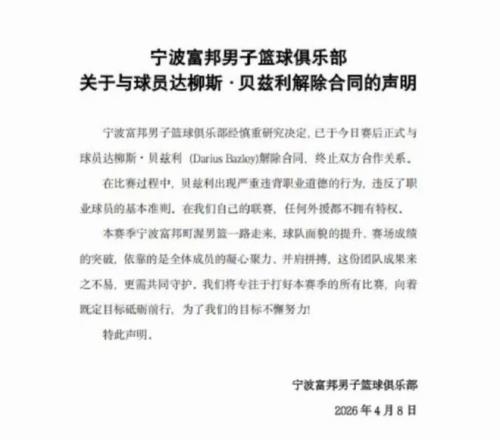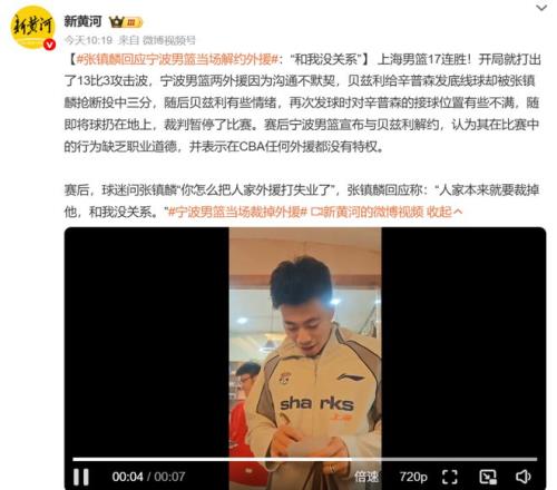 這一下“內訌”成了導火索,寧波男籃在比賽結束之后立即發了公告,宣布跟貝茲利解約。