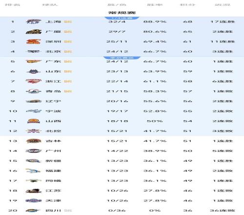 對比上賽季,本賽季的常規賽輪次調整為42輪,季后賽仍然采取3-3-5-7賽制。目前常規賽僅剩最后幾輪,關于季后賽席位的爭奪非常激烈,上海隊、廣廈隊、北京隊、廣東隊、深圳隊、山東隊、青島隊、浙江隊已經晉級季后賽,還剩下4個晉級名額等待產生。