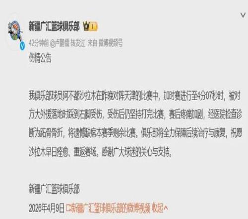 新疆隊官方宣布:阿不都沙拉木賽季報銷......