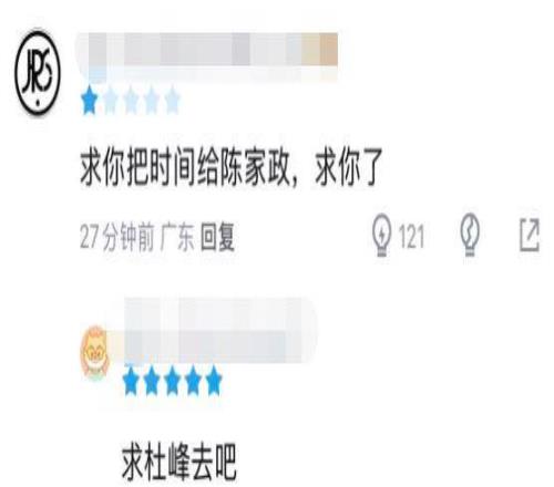 而在后衛線上,杜鋒放著更具潛力的陳家政不用,一而再再而三信賴胡明軒,也引起了廣東自家球迷的不滿,直言:把你的出場時間讓給陳家政。