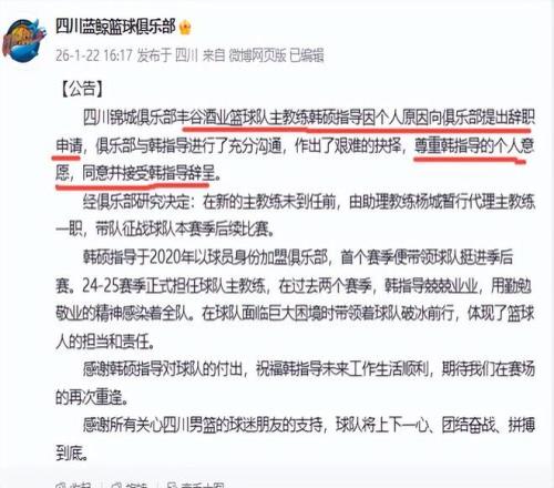 下課主帥+1!韓碩辭任四川男籃主教練,本賽季至今無一勝績