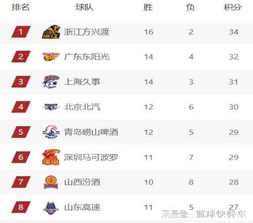 CBA積分榜最新排名出爐!北京殺回前4:廣廈穩居第1山西第7