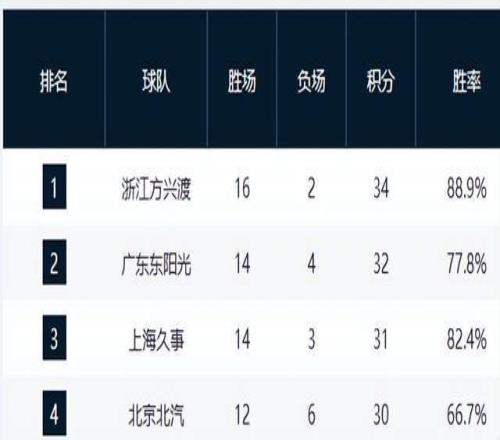 廣廈作為衛(wèi)冕冠軍,實(shí)力強(qiáng)勁,目前以16勝2負(fù)的戰(zhàn)績領(lǐng)跑積分榜,勝率達(dá)到驚人的88.9%,是CBA20支球隊中唯一一支勝率超過85%的球隊。廣東隊以14勝4負(fù)的戰(zhàn)績緊隨其后,上海隊則因少賽一輪,以14勝3負(fù)的戰(zhàn)績暫居第三。