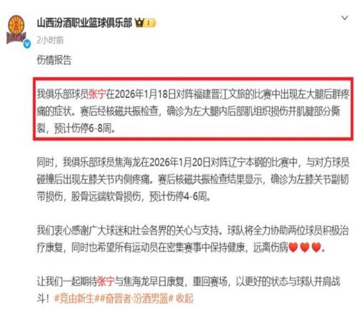 據山西男籃官宣,張寧的左側大腿后肌群出現了損傷,肌腱部分撕裂,一動就疼,因此他必須開始休養,預計傷停6到8周的時間。山西男籃毫無疑問會非常困難,他們本賽季失去了主力外援古德溫,球隊沒有合格的控球后衛了。