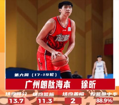 在與同曦隊的比賽中,徐昕在加時賽力挽狂瀾,獨砍8分,幫助廣州隊贏下比賽。全場比賽,徐昕10投9中,罰球6罰6中,砍下了24分14籃板2蓋帽的超級數據。與青島隊的比賽,徐昕在最后的時候,連續摘下關鍵的籃板球,成為了廣州隊擊敗青島隊的關鍵先生。本場比賽,徐昕交出13分10籃板的兩雙數據。