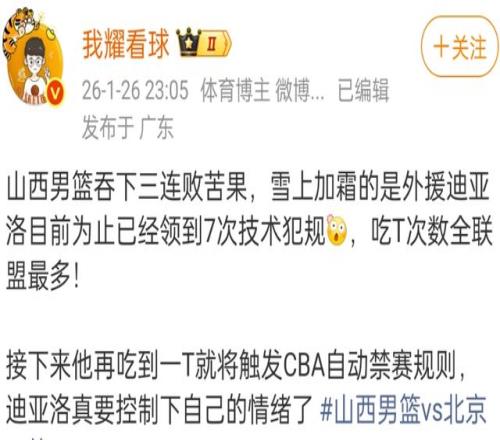 最近幾場比賽,山西男籃的外援迪亞洛成為了風口浪尖的人物,幾乎每場比賽他都會和對手發生沖突,當然,迪亞洛肯定是被針對的,甚至是一些戰術故意激怒他。和北京首鋼的比賽結束后,迪亞洛賽季累計了7次技術犯規,根據規則,第8次將會被禁賽一場,隨后每兩次就會被禁賽1場。