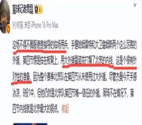 足智多謀!貴叔用場均7分之人打爆北京隊,賈磊:不得不佩服貴叔