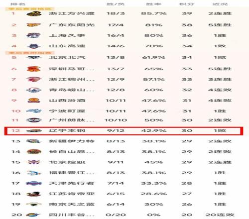 這個賽季遼寧隊的下滑速度更快,前21場比賽,僅僅拿到9場勝利,輸掉了12場,勝率只有42.8%。過去6場比賽更是輸掉了5場,不敵深圳、山西、山東、新疆和寧波。對陣新疆只拿到59分,對陣寧波只拿到62分,球隊的進攻乏力,士氣受挫,充滿了無力感。
