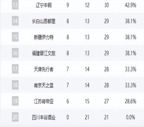 遼寧隊(duì)作為四冠王,戰(zhàn)績(jī)滑落至9勝12負(fù),排名跌至第13位,賽季表現(xiàn)遠(yuǎn)低于預(yù)期。福建隊(duì)、新疆隊(duì)、吉林隊(duì)同為8勝13負(fù),陷入中游泥潭。同曦隊(duì)(7勝14負(fù))、天津隊(duì)(6勝15負(fù))、江蘇隊(duì)(5勝16負(fù))與四川隊(duì)(0勝21負(fù))則深陷倒數(shù)深淵,其中四川隊(duì)已遭遇21連敗,創(chuàng)CBA歷史最差開局紀(jì)錄。