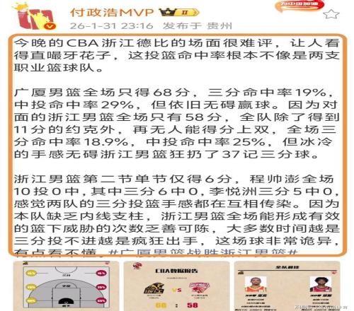 “三分越是不進越是投三分,這場球非常詭異,有點看不懂。”,付政浩最后寫道。實話實說,這是迄今為止,筆者看到的最惡心的浙江德比賽,沒有之一。