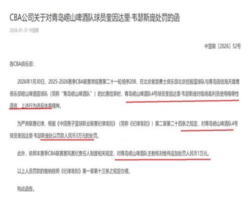 在賽后,CBA公司也是針對(duì)此事進(jìn)行了調(diào)查,最終,認(rèn)定青島隊(duì)外援奎因達(dá)里·韋瑟斯龐,在賽后,對(duì)當(dāng)值裁判員使用侮辱性語(yǔ)言,這樣的行為,嚴(yán)重違反了體育精神。