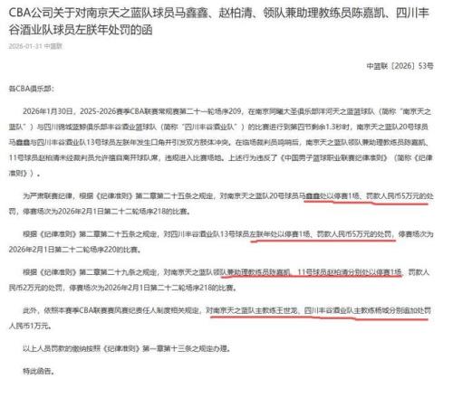 2月1日,中午12點(diǎn)!CBA公司開出一份大罰單,同曦隊(duì)、四川隊(duì)一共有4人被停賽,6人被罰款,兩隊(duì)的罰款金額達(dá)到160000元...