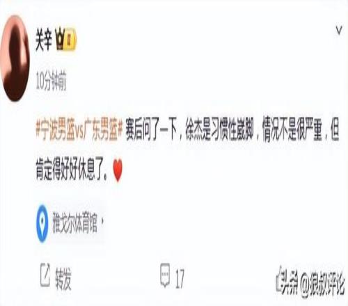 不久前,廣東體育頻道記者關(guān)辛發(fā)文報道,徐杰是習(xí)慣性崴腳,情況不是很嚴(yán)重,但肯定得好好休息了。