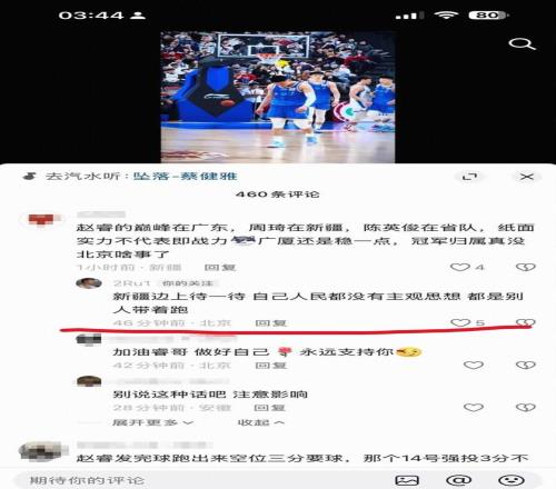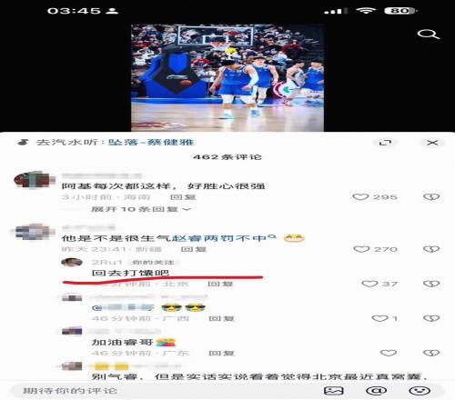 賽后,在社交媒體上出現了批評北京和趙睿的內容,據網傳圖片顯示,北京后衛趙睿現身評論區,回復了兩名IP屬地新疆的球迷。