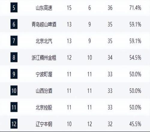 黑馬深圳與山東分列第四、第五,山東少賽一場但勝場占優(yōu),理論上排名第四。兩隊近期狀態(tài)火熱,10戰(zhàn)8勝,展現(xiàn)出強勁的競爭力。另一黑馬青島隊擊敗北京止住五連敗頹勢,排名第六;北京則遭遇兩連敗,排名下滑至第七,球隊磨合問題與主教練許利民的用人策略備受質疑。浙江隊雖位列第八,但本輪負于廣廈暴露了與頂級強隊的實力差距。