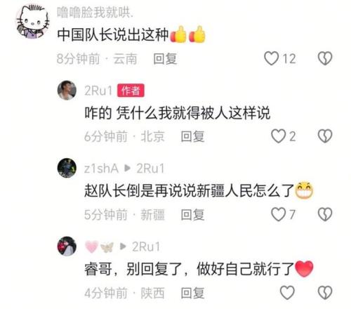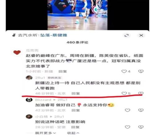 真正引發風波的并非賽場上的失誤,而是賽后在社交媒體上的互動,一位新疆球迷留言評價道:“趙睿的巔峰在廣東,周琦在新疆,陳盈駿在省隊,紙面實力不代表即戰力,廣廈還是穩一點,冠軍歸屬真沒北京啥事了。”,這句話似乎觸動了趙睿敏感的神經,他的回復不僅涉及籃球討論,更上升到對新疆人民的主觀評價:“新疆邊上待一待,自己人民都沒有主觀思想,都是別人帶著跑。”