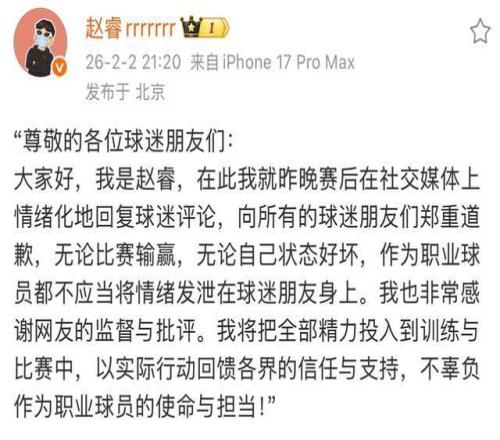 面對洶涌輿情,趙睿在24小時內火速更新社交動態,公開致歉:“昨晚賽后在社交媒體上情緒化地回復球迷評論,向所有球迷朋友們鄭重道歉。無論比賽輸贏,無論自己狀態好壞,作為職業球員,都不應將情緒發泄在球迷身上?!?/strong>言辭誠懇,態度明確。這一及時止損的舉動,雖未能完全平息爭議,但至少展現了職業球員應有的擔當。