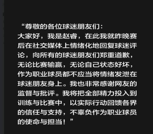 大家好,我是趙睿,在此我就昨晚賽后在社交媒體上情緒化地回復球迷評論,向所有的球迷朋友們鄭重道歉,無論比賽輸贏,無論自己狀態好壞,作為職業球員都不應當將情緒發泄在球迷朋友身上。我也非常感謝網友的監督與批評。我將把全部精力投入到訓練與比賽中,以實際行動回饋各界的信任與支持,不辜負作為職業球員的使命與擔當!”