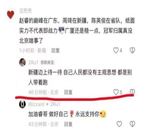 結(jié)果在賽后,氣急敗壞的趙睿打開了個人社媒賬號,開始跟球迷對線,其中就瞄準(zhǔn)了IP在新疆的球迷,開始胡亂說話,一下子引起了新疆球迷的憤怒。更為關(guān)鍵的是,趙睿的措辭出現(xiàn)了很嚴(yán)重的錯誤,他針對的不僅僅是球迷,而是更廣大的群體。