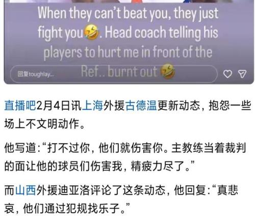 另一方面,涉及本次事件的上海隊外援古德溫,近期一直處于輿論的焦點,此前他曾在社交媒體上發表過針對廣東隊教練的言論,而本場比賽他再次在關鍵時刻成為影響比賽走勢的人物。