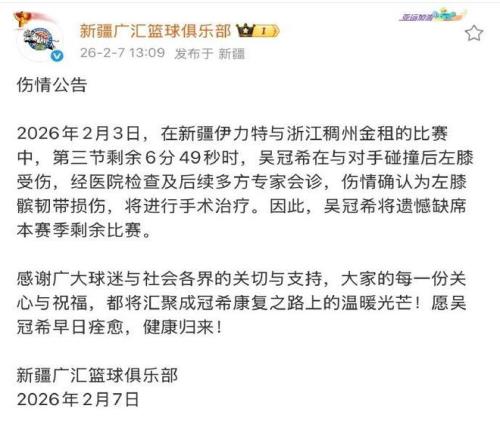 新疆男籃官方傷病公告寫道:“2026年2月3日,在新疆男籃與浙江男籃的比賽中,第三節(jié)剩余6分49秒時(shí),吳冠希在與對(duì)手碰撞后左膝受傷。經(jīng)醫(yī)院檢查及后續(xù)多方專家會(huì)診,傷情確認(rèn)為左膝髕韌帶損傷,將進(jìn)行手術(shù)治療,因此吳冠希將遺憾缺席本賽季剩余比賽。”