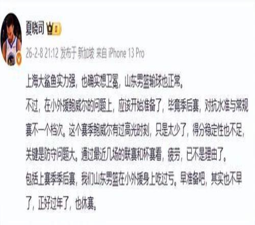 那么,山東男籃到底輸在哪里了呢?賽后,山東媒體人夏曉司在社交平臺(tái)給出了自己的答案。
