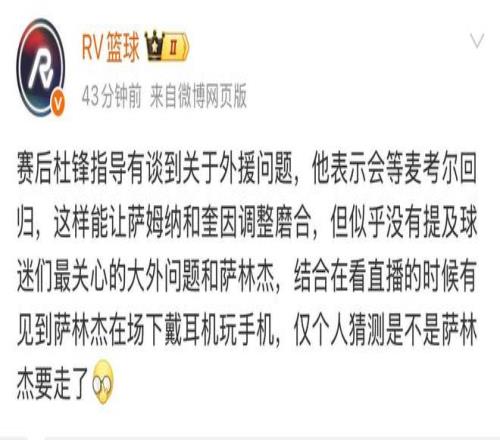 關于薩林杰的去留問題,杜鋒并沒有談,不過有媒體爆料,廣東宏遠可能會裁掉薩林杰。