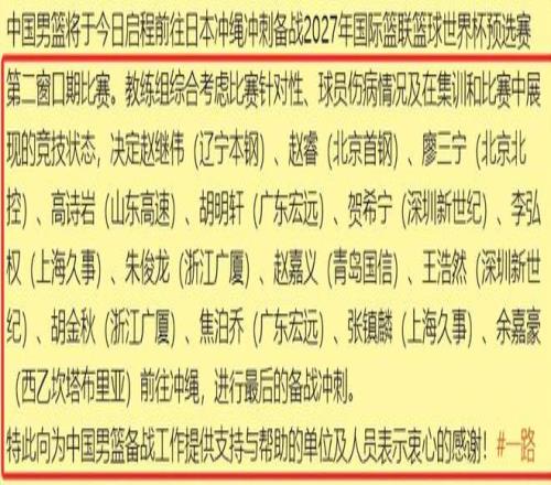 北京時間2月23日,是中國男籃出發前往日本的日子,與此同時,中國男籃也正式官宣了入選此次世界杯預選賽的14人名單。分別是后衛趙睿、趙繼偉、廖三寧、胡明軒和高詩巖;鋒線球員張鎮麟、朱俊龍、賀希寧、王浩然、李弘權和趙嘉義;內線球員胡金秋、焦泊喬和余嘉豪。