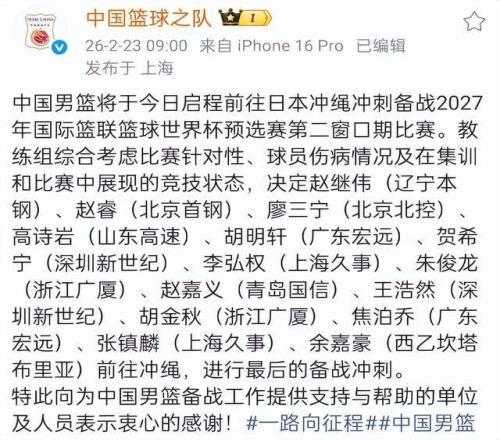 就在本次窗口期比賽前,中國男籃終于官方公布了14人名單,其中包括了胡明軒、趙繼偉、趙睿、高詩巖、賀希寧、李弘權、朱俊龍、趙嘉義、王浩然、胡金秋、焦泊喬、張鎮麟、余嘉豪、廖三寧。