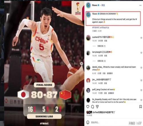 FIBA世界杯官方賬號在報道這場比賽的比分時寫道:”China with a sneaky win over Japan”,翻譯過來就是“中國隊偷偷摸摸地戰勝了日本隊。”