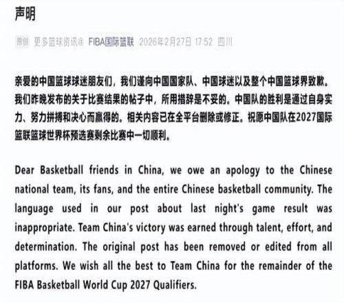 - “我們謹(jǐn)向中國(guó)男籃國(guó)家隊(duì)、中國(guó)球迷以及整個(gè)中國(guó)籃球界致歉……中國(guó)男籃的勝利是通過(guò)自身實(shí)力、努力拼搏和決心而贏得。”