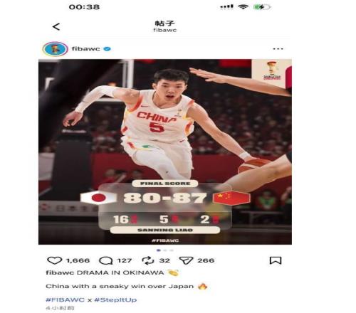 可賽后,F(xiàn)IBA官方社媒發(fā)了一條推文:“China with a sneaky win over Japan”。