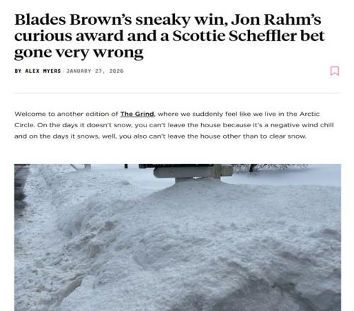 再比如《高爾夫文摘》1月27日對巴哈馬國際巡回賽的戰況介紹標題為“Blades Brown’s sneaky win, Jon Rahm’s curious award and a Scottie Scheffler bet gone very wrong”(布萊茲?布朗的意外制勝、喬恩?拉姆的離奇獎項,還有斯科蒂?謝夫勒那場徹底搞砸的賭約)。
