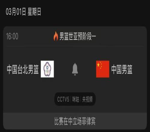 根據(jù)賽程安排,3月1號16點(diǎn)00分中國男籃將在菲律賓的馬尼拉,對陣省隊中國臺北男籃;屆時,CCTV5將全程直播。考慮到中國男籃剛在客場贏下日本男籃,還是得將贏球的經(jīng)驗吸收好,在一些時刻繼續(xù)使用三后衛(wèi)的打法,才能將我們的優(yōu)勢延續(xù)下去。