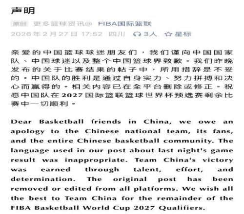 不僅如此,F(xiàn)IBA官方還發(fā)布聲明,表示在中國男籃戰(zhàn)勝日本男籃的比賽結(jié)果帖子中的措辭不當(dāng),而向中國男籃、中國球迷以及整個(gè)中國籃球界致歉。這則道歉聲明使用了中英雙語,不僅通過中文官方發(fā)出,還在引起誤會(huì)的Instagram官方賽果帖的評(píng)論區(qū)同步了道歉的內(nèi)容。這樣來看的話,F(xiàn)IBA的道歉還是非常有誠意的。只是希望在以后的比賽中,F(xiàn)IBA官方也能要求裁判做到公平公正,不要再那么明顯針對(duì)中國男籃了。