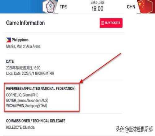 FIBA的官網(wǎng)顯示,雙方比賽的裁判員以及所屬籃協(xié)信息已經(jīng)出爐如下圖: