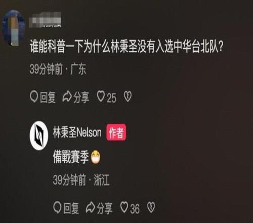 林秉圣此前曾入選中國臺北男籃代表隊,但在此次窗口期落選,無緣出戰世預賽,有球迷在評論區詢問為什么落選,林秉圣回復道是為了備戰賽季。