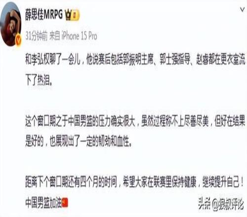 薛思佳寫道:“和李弘權聊了一會兒,他說賽后包括郭振明主席、郭士強指導、趙睿都在更衣室流下了熱淚。”