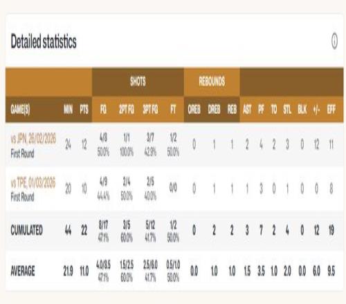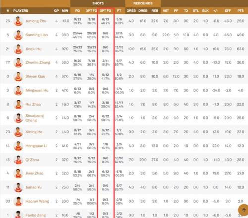 朱俊龍四場球三分13中6,程帥澎兩場三分12中6,高詩巖4場三分12中5,賀希寧兩場12中5,趙繼偉兩場12中6,這些球員都是三分投得非常出色的存在,可賀希寧與趙繼偉兩人不管是產量、命中率都在第一檔。